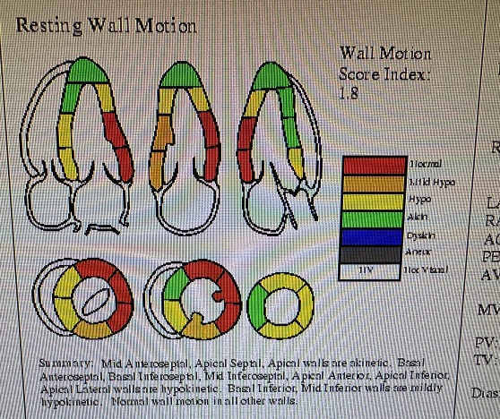 So the question remains, why the extensive changes on the EKG when the lesion is localized and one would have expected changes in the inferior or inferior and lateral leads. Could the patient have a hypercoagulable state? malignancy?. There is no evidence of spontaneous dissection. Concomitant spasm in the LAD with the thrombus in the LCX is a possibility (reported by us in 1990’s and the two published articles are on this website). her troponins peaked at 8500. Echocardiogram showed wall motion abnormalities as follows: