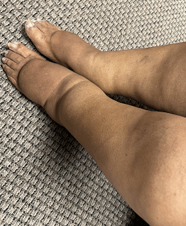Lower Extremities: Lymphostatic elephantiasis; Bilateral non pitting edema extending up to the knees : Skin appears normal with no signs of cellulitis or ulceration; Tenderness on palpation.