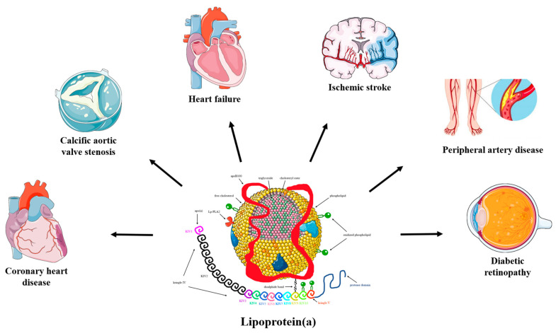 Similar to LDL-cholesterol, the cholesterol found in Lp(a) can accumulate in the walls of your blood vessels. The higher your Lp(a) level, the greater the likelihood of this occurring. These deposits of cholesterol, known as plaques, have the potential to reduce blood flow to various organs such as the heart, brain, kidneys, lungs, legs, and other parts of the body. Over time, plaques can gradually grow or suddenly rupture, obstructing blood vessels and resulting in heart attacks or strokes.Lp(a) has the potential to induce heightened clotting, which in turn can result in the formation of blockages in blood vessels at a rapid pace. Lp(a) promotes inflammation which increases the likelihood that plaques will rupture.(2) Additionally, heightened levels of Lp(a) can contribute to the development of aortic stenosis, a condition characterized by the narrowing of the aortic valve due to inflammation. This chronic inflammation can lead to the accumulation of calcium on the valve, resulting in stiffness. As a consequence, blood flow may be compromised if the valve fails to open fully. In certain instances, individuals with aortic stenosis may require surgical intervention or a procedure to replace the affected aortic valve.(2) Convincing evidence has emerged from pathophysiological, epidemiological, and genetic studies on the causality of high serum lipoprotein(a) (Lp(a)) levels as a potent risk factor for coronary heart disease (CHD), ischemic stroke, peripheral artery disease, heart failure, calcific aortic valve stenosis (CAVS), mitral valve stenosis, and retinopathy in patients with diabetes.(14) (Fig. 1)