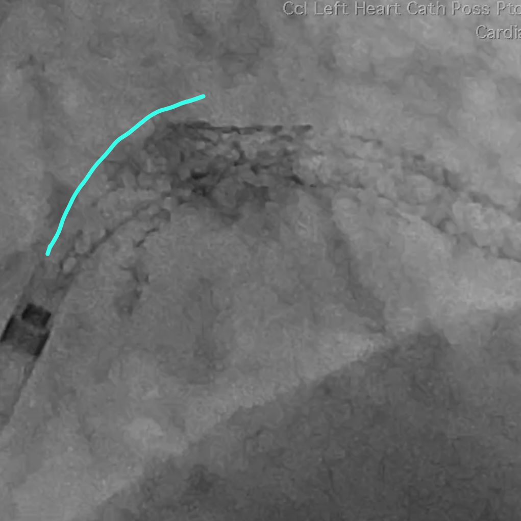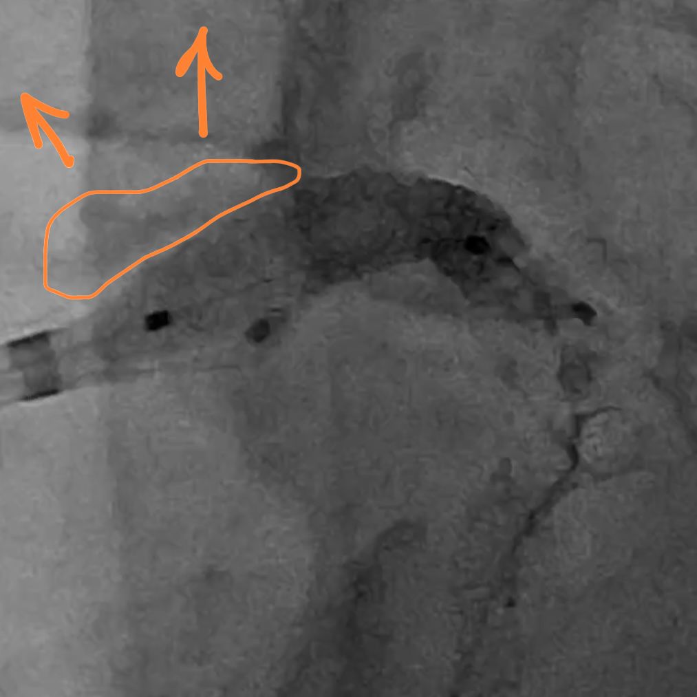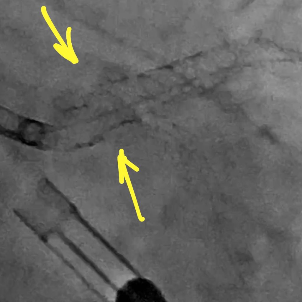 Here is the CFA after Impella removal. We did not use single access because I wanted to use a 7 French guide without any of the drama. A 7 French sheath is often quite snug in the Impella insertion sheath. The double access also allowed us to ensure that the bleeding at the Impella insertion site had completely stopped before the patient left the Cath Lab. This was on on account of his inability to receive blood being a Jehovah’s witness.