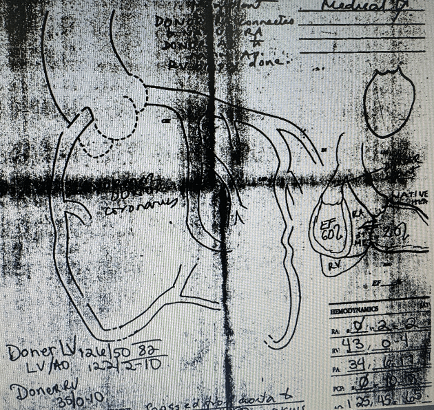 In late 1990s a 65 year old male patient from North Pole Alaska came to me with a complaint of shortness of breath. We found that he had end stage low EF congestive cardiac failure and after the usual workup enlisted him for heart transplant. He was lucky to get one and Dr. Howard Frazier ( who to this day has done the most heart transplants on the Planet) performed a rather atypical heart transplant on him. Instead of removing the entire front part of the recipient heart and suturing the donor heart over it, he did what was called ” a piggy back transplant” in which he left the native heart alone and connected the donor heart to the aorta and the RA/RV , thus creating a sort of ” Left ventricular Assist Device”. I am not sure what the exact reason for this experiment was but apparently he knew what he was doing The patient did well and went home and continued to improve for several months off this piggy back heart. He came back from Alaska and I did a cardiac cath on him as was the protocol along with an endomyocardial biopsy of the donor heart to check for rejection. I got the most strange experience of looking for two sets of coronaries and two left ventriculograms in the same person. The native coronaries were diseased but the donor coronaries were normal angiographically.