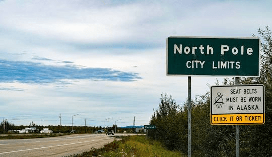 North Pole is a small Alaskan city, near Fairbanks. It’s known for its year-round Christmas decorations, including candy cane–striped street lights. Santa Claus House is a Christmas store with walls covered in children’s letters to Santa and a huge Santa statue outside. Streets have names like Kris Kringle Drive and Mistletoe Lane;