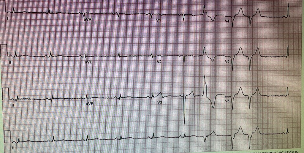 EKG done the next day. Patient did well clinically. The global ejection fraction was 45-49%. Incidentally patient also took Adderal of and on for attention deficit disorder. There are reports that these drugs can increase the incidence of cardiovascular events. INDEBTED TO COMMENTS ON THIS CASE BY: Prof. Salman Arain Dr. Syed Arman Raza Dr. Farhan Katchi Dr. Zubair Mohammad Syed Dr. Syed Fazal Dr. Usman Mustafa
