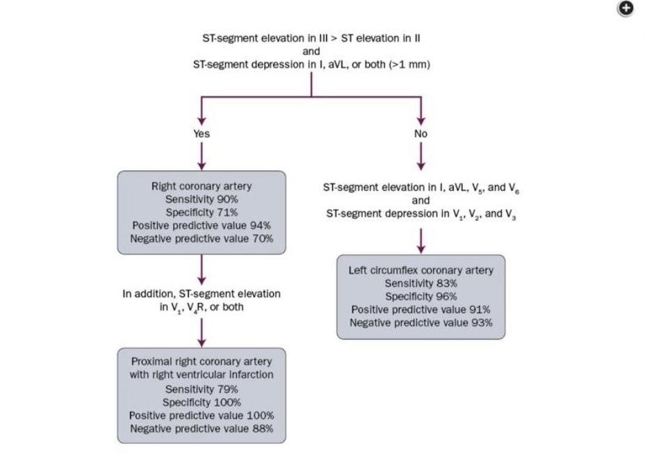 We put it through our panel to see if they could figure out the location of the culprit lesion in this STEMI patient. The answers ranged from a large dominant circumflex or RCA to a combined lesion in the LCX and LAD. Take a moment and see if you can tell the location of the lesion. Perhaps you can use the chart that was went by Dr. Syed Fazal: